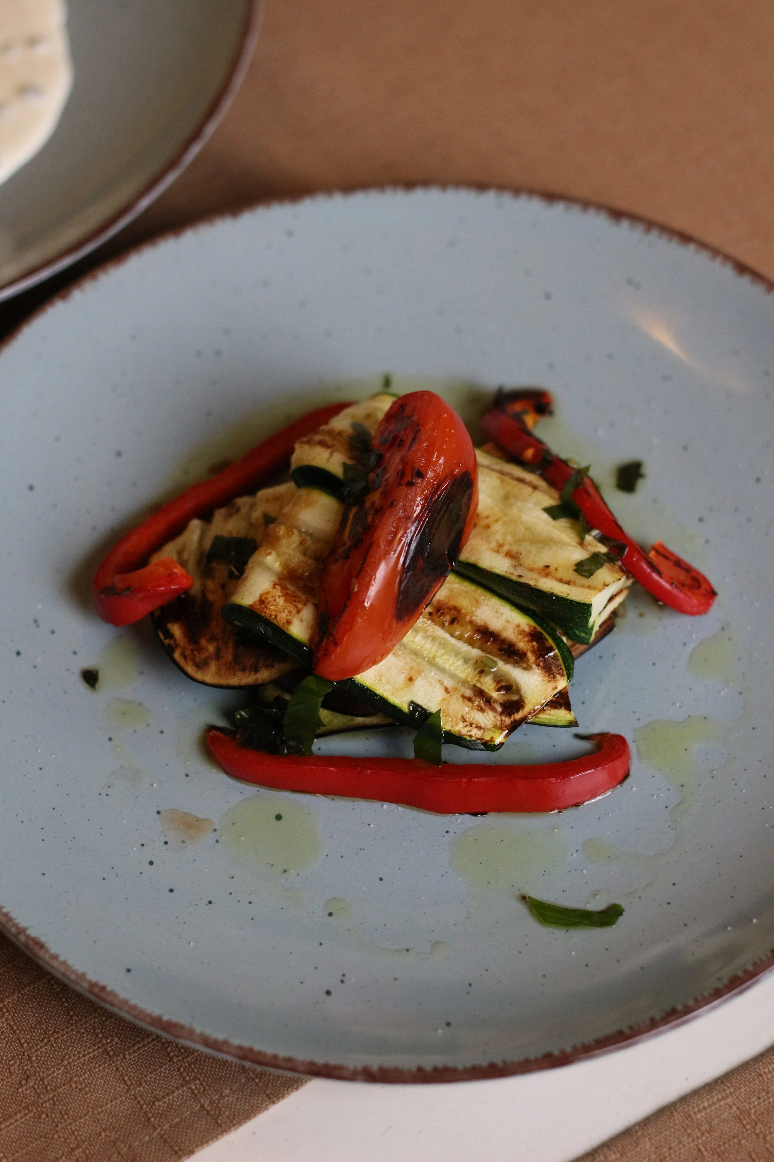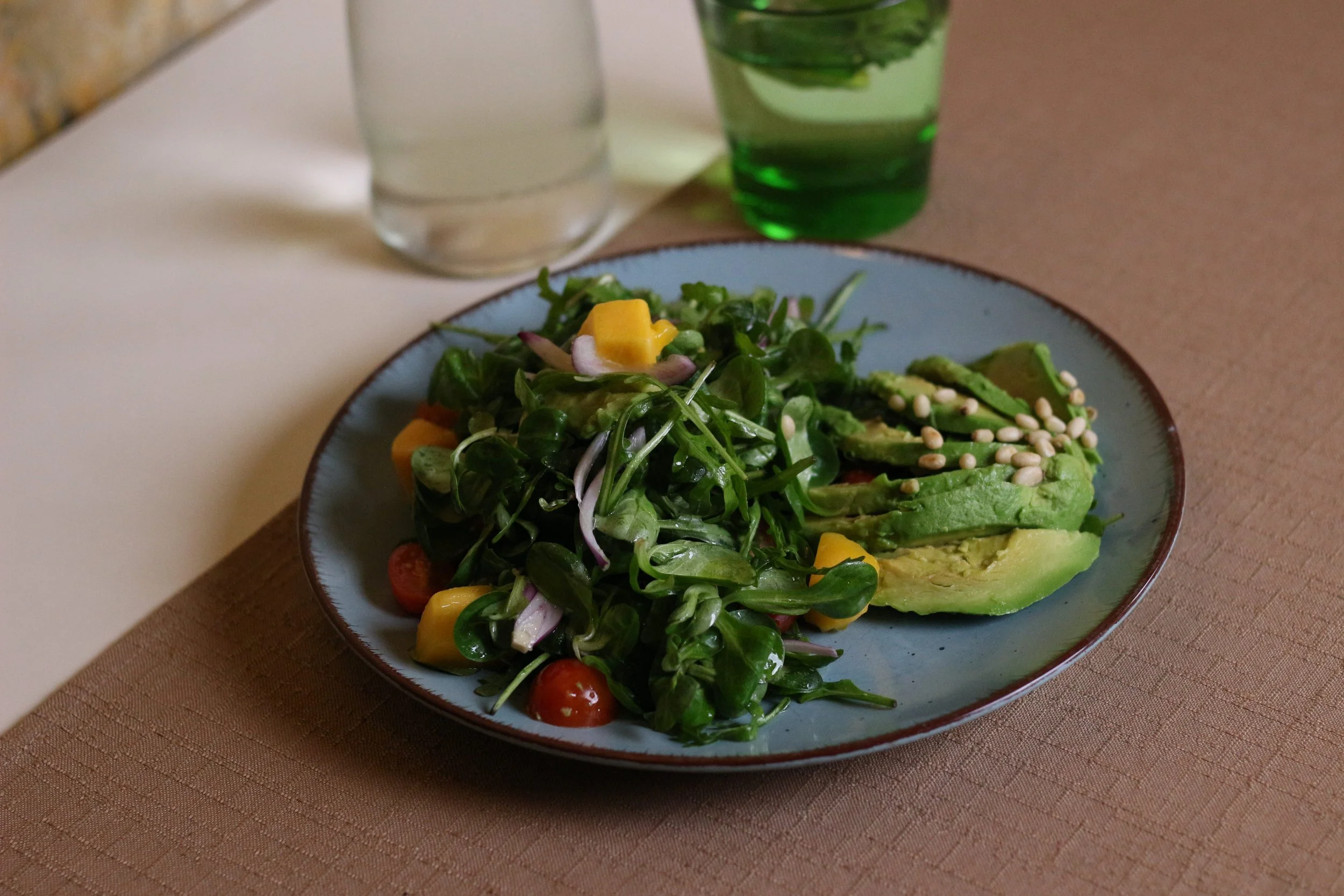 Plate of sautéed vegetables with greens, served with a glass of water with lemon and mint, on a table.