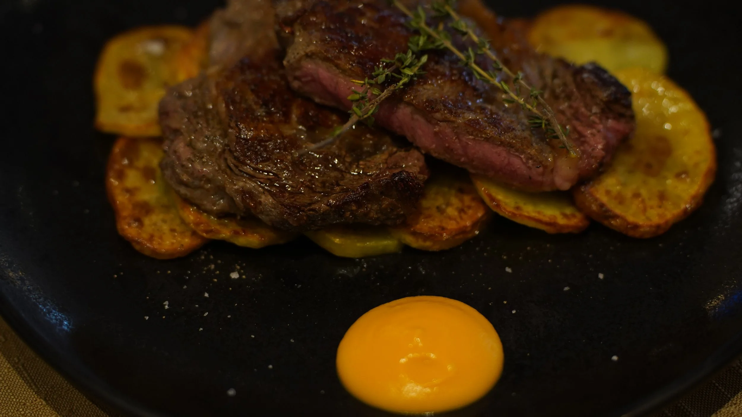 Roasted octopus dish with cherry tomatoes and potatoes garnished with greens