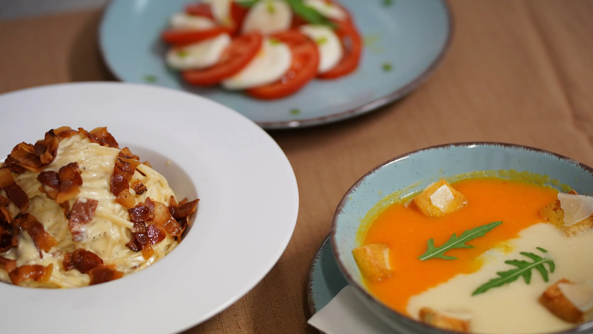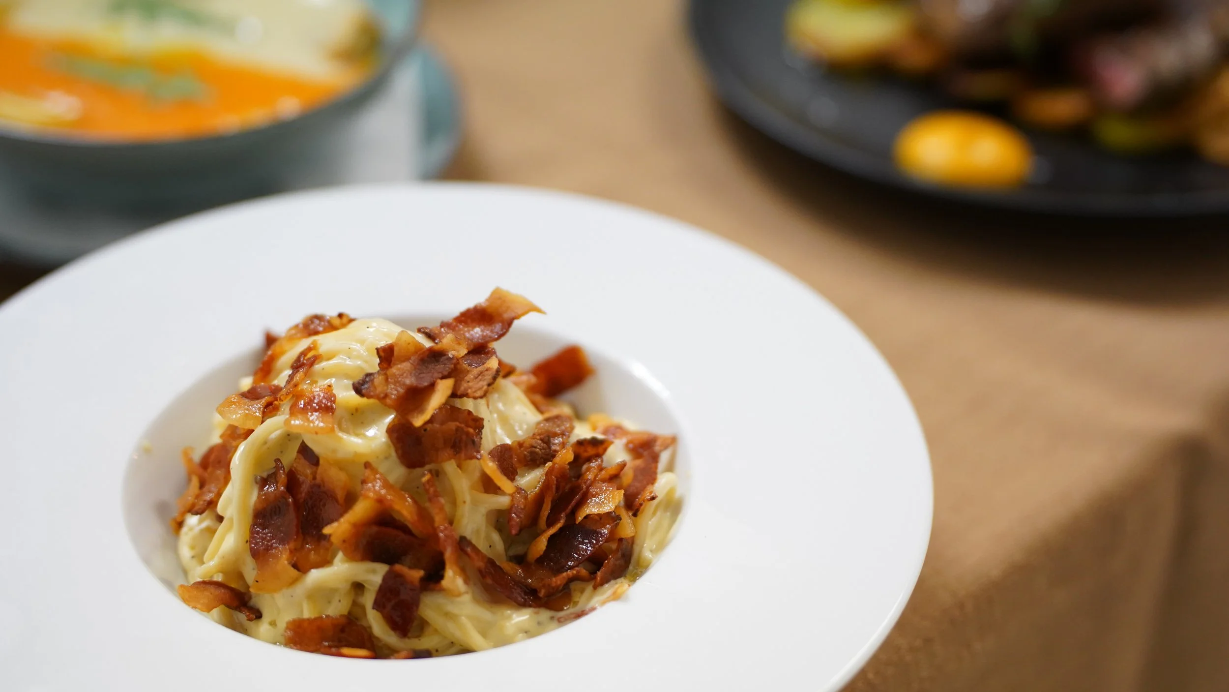 Spaghetti carbonara with black pepper and bacon in a bowl on a table
