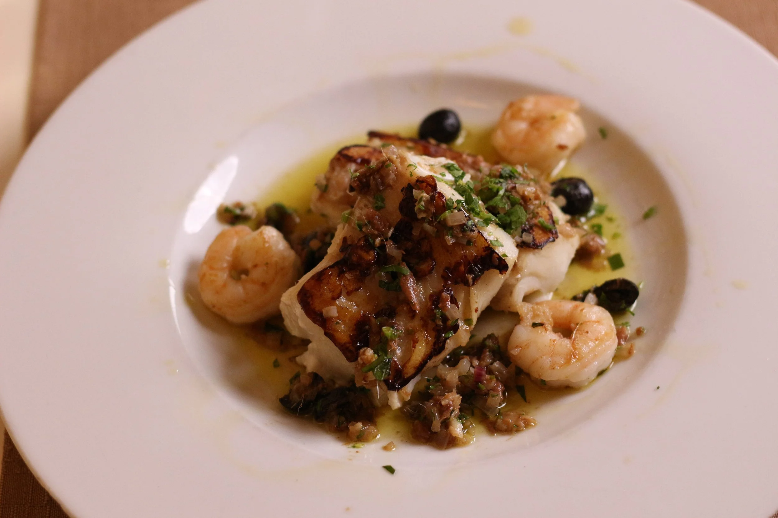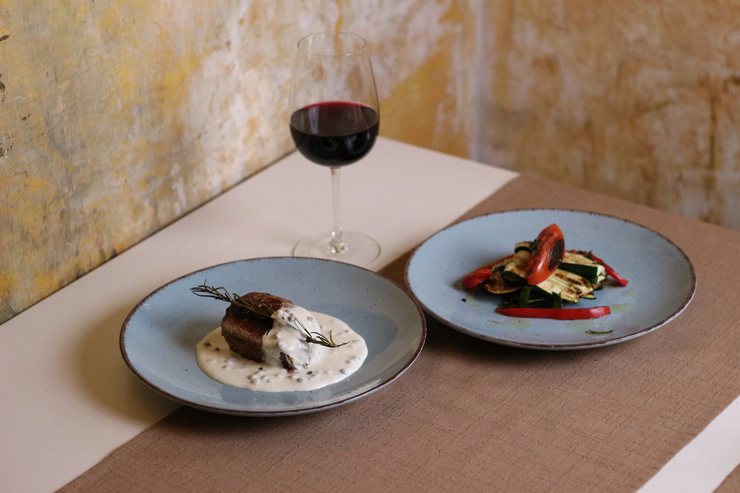 Plate of cooked salmon with cherry tomatoes and greens, alongside a glass of white wine on a beige tablecloth.