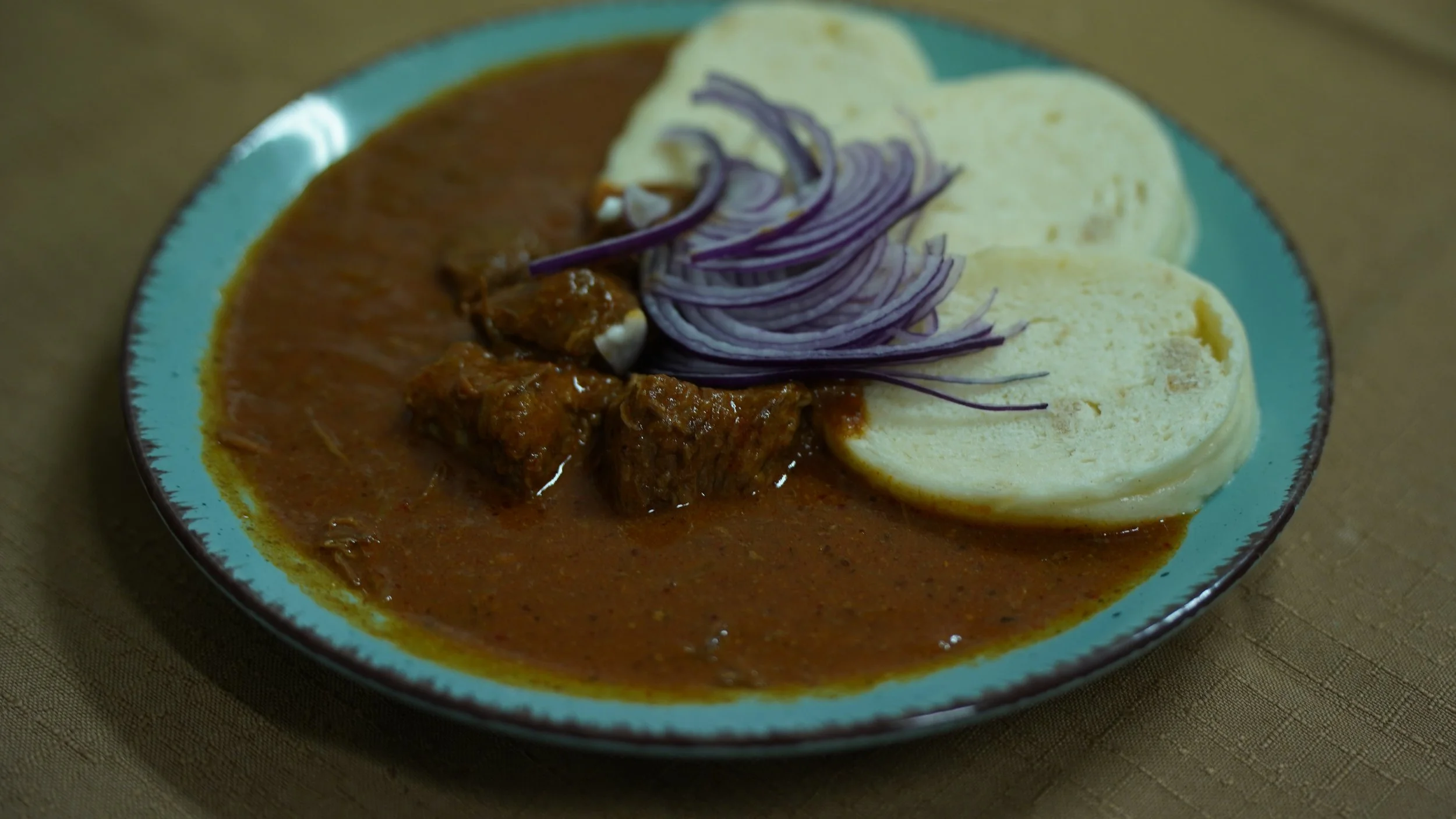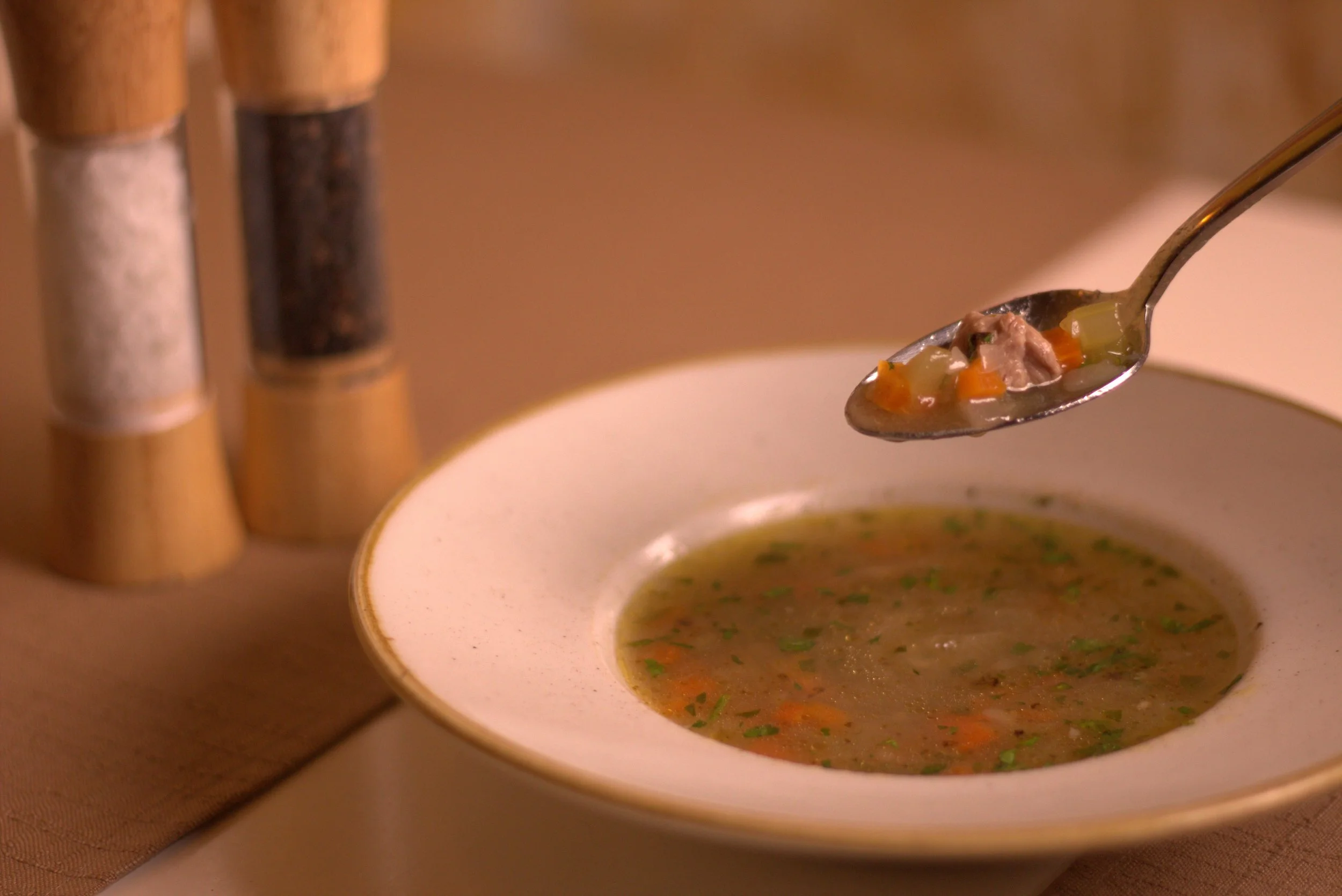 Bowl of soup with herbs beside a spoon on a napkin and salt and pepper shakers.