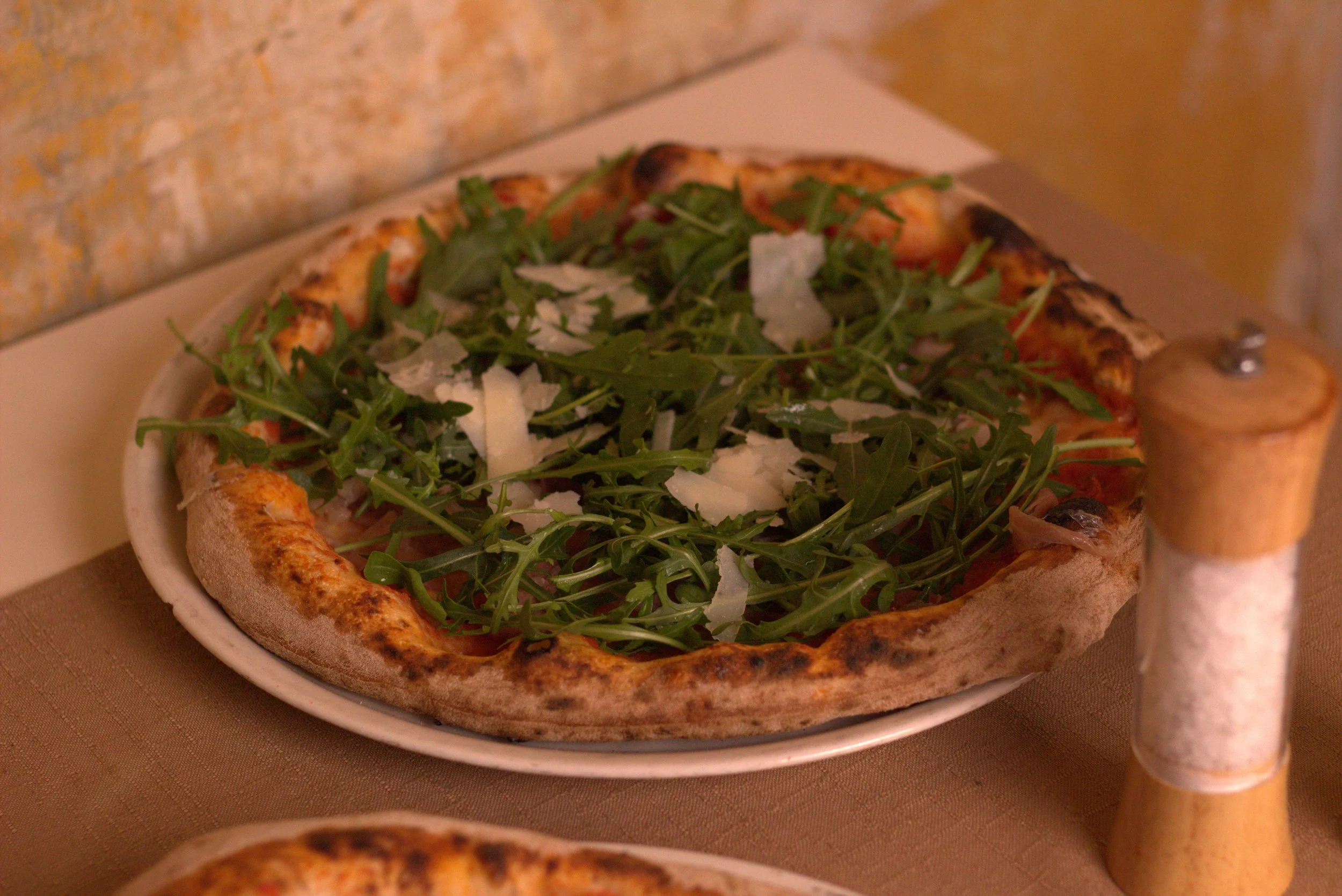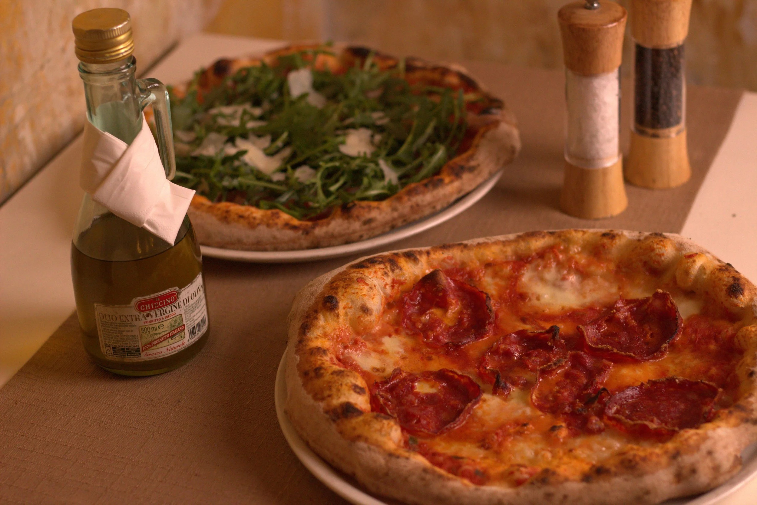 Two pizzas on a table with a bottle of olive oil and salt and pepper shakers