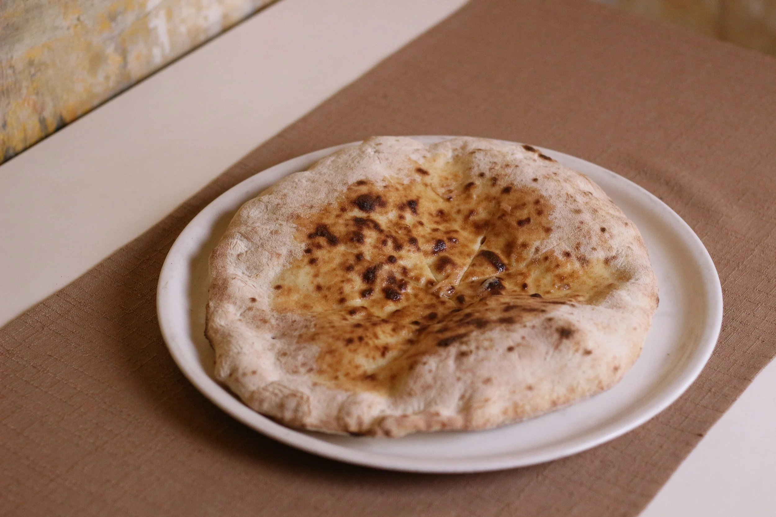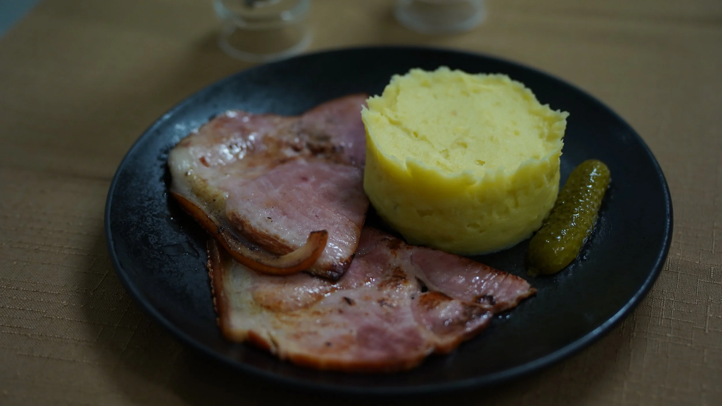 A pizza with tomato sauce, cheese, ham, and a dollop of cream cheese on a plate.