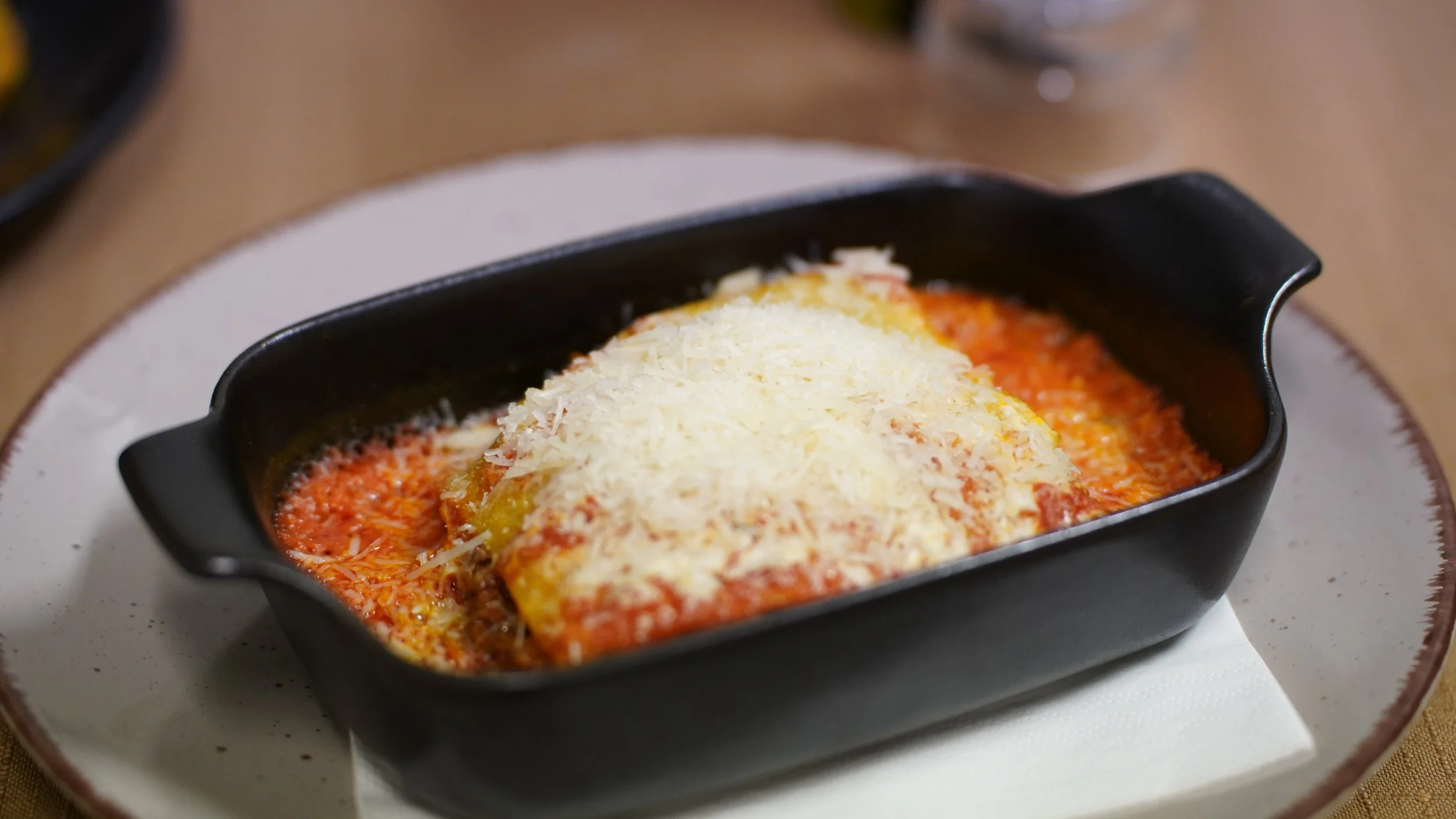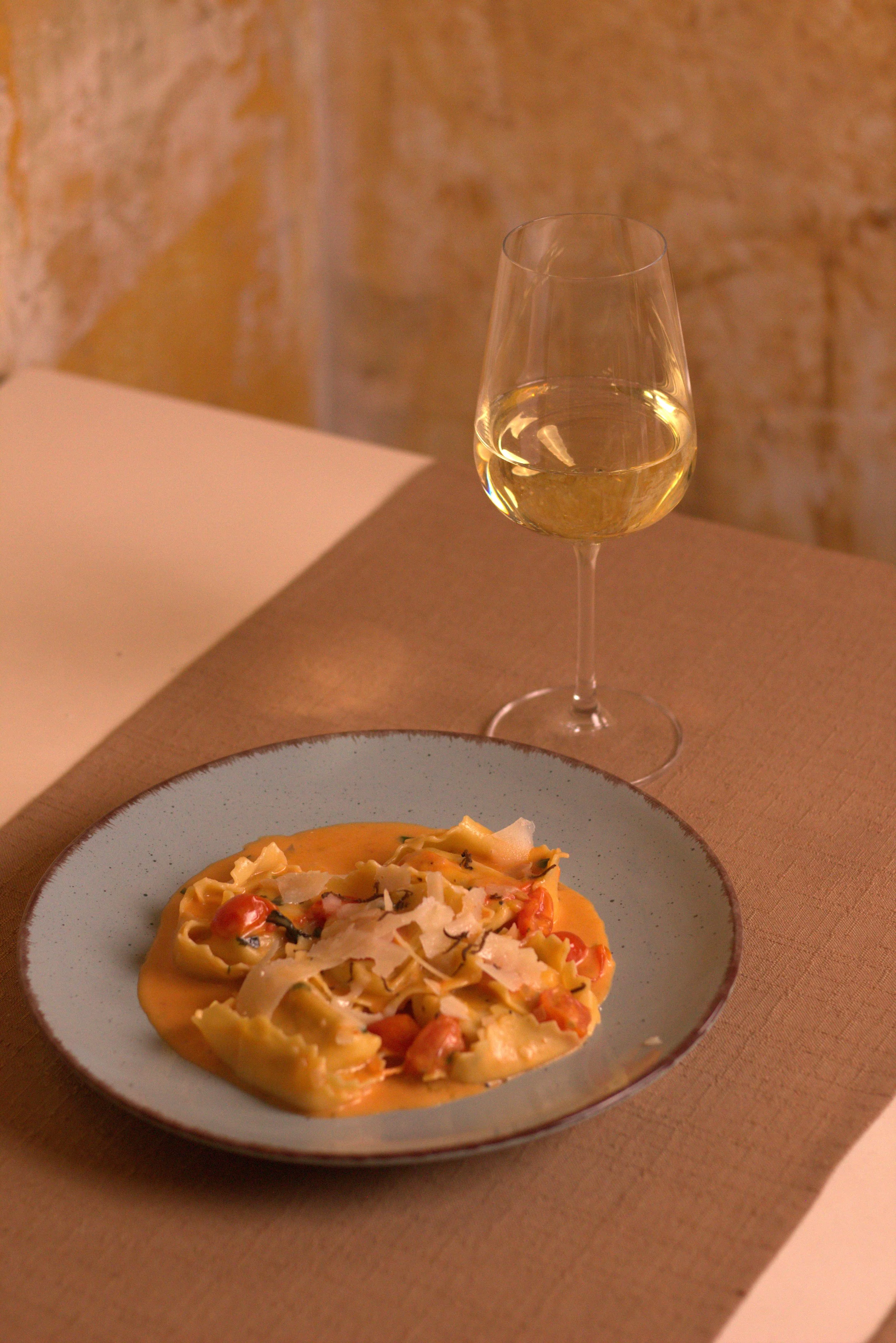Pasta dish with creamy sauce and shaved parmesan on a plate, next to a glass of white wine.