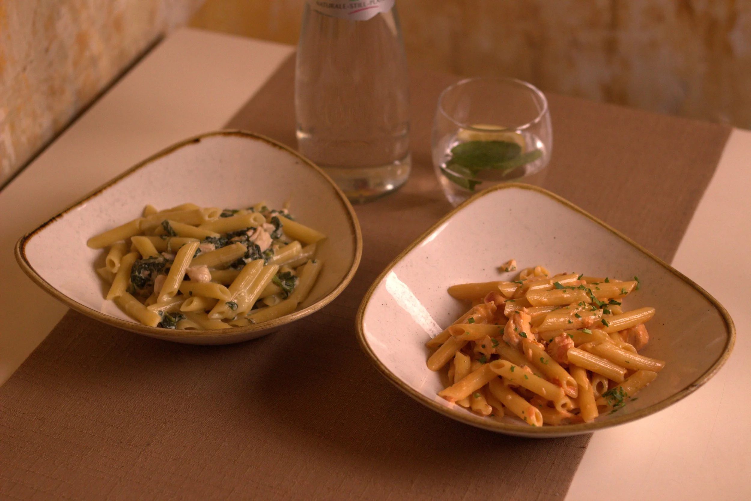 Two bowls of penne pasta, one with a creamy spinach and chicken sauce, and the other with a tomato-based sauce and herbs, placed on a table with a glass of water and a bottle nearby.