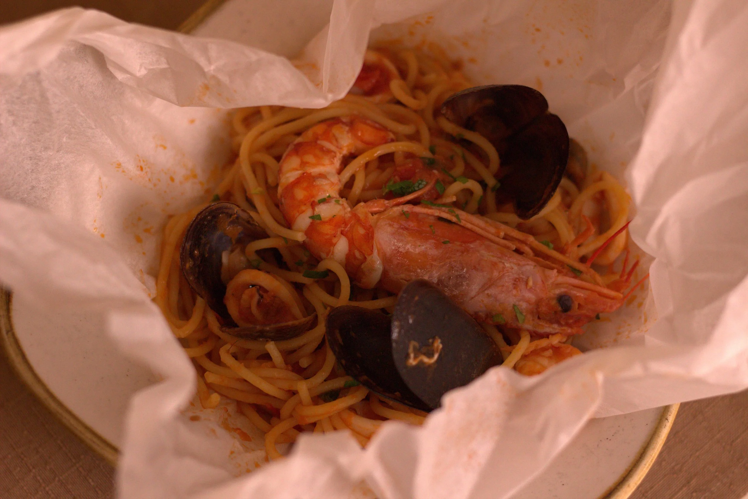 Seafood spaghetti with shrimp and mussels in parchment paper